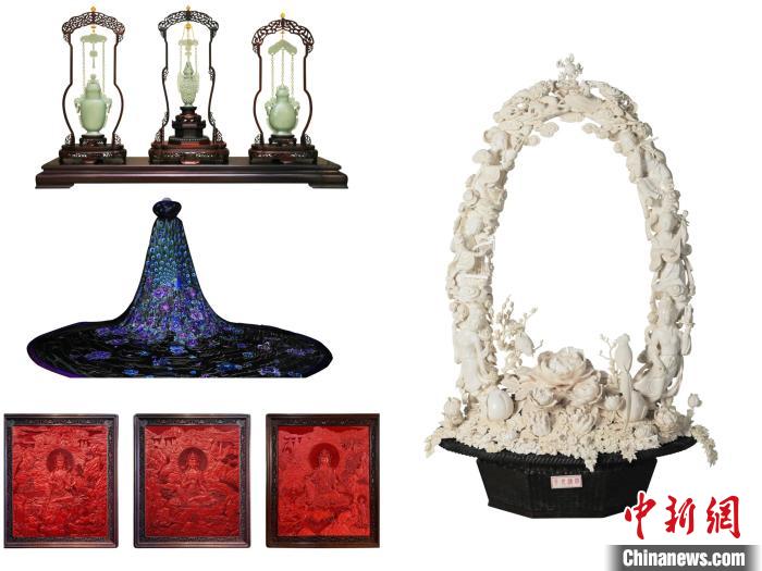 《纏枝蓮紋吊鏈瓶》(玉雕)、《四海升平》(牙雕)、《碧泓云想富貴長(zhǎng)天錦繡雀裘》(京繡)和《雕漆剔紅法海寺壁畫》(雕漆)四件作品被認(rèn)定為北京傳統(tǒng)工藝美術(shù)珍品。 主辦方供圖
