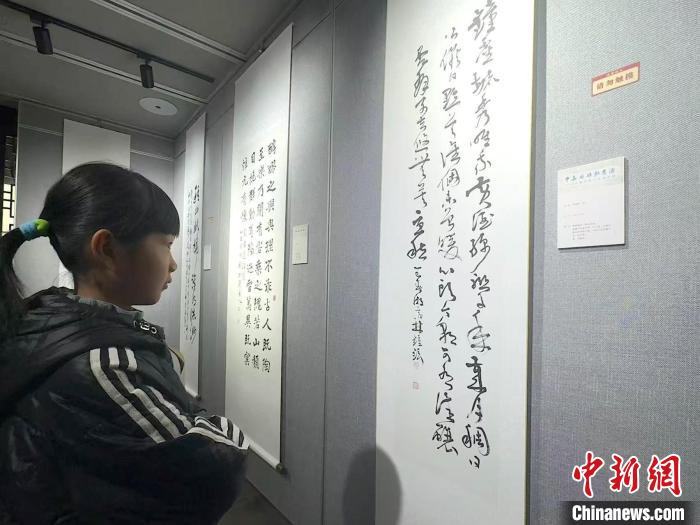 3月30日,一名女孩欣賞韓國(guó)書(shū)法家的書(shū)法作品。項(xiàng)菁 攝