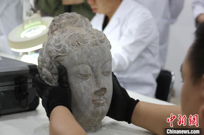 5月20日,河南洛陽(yáng),龍門石窟研究院工作人員展示已完成修復(fù)的唐代佛頭。 中新社記者 闞力 攝
