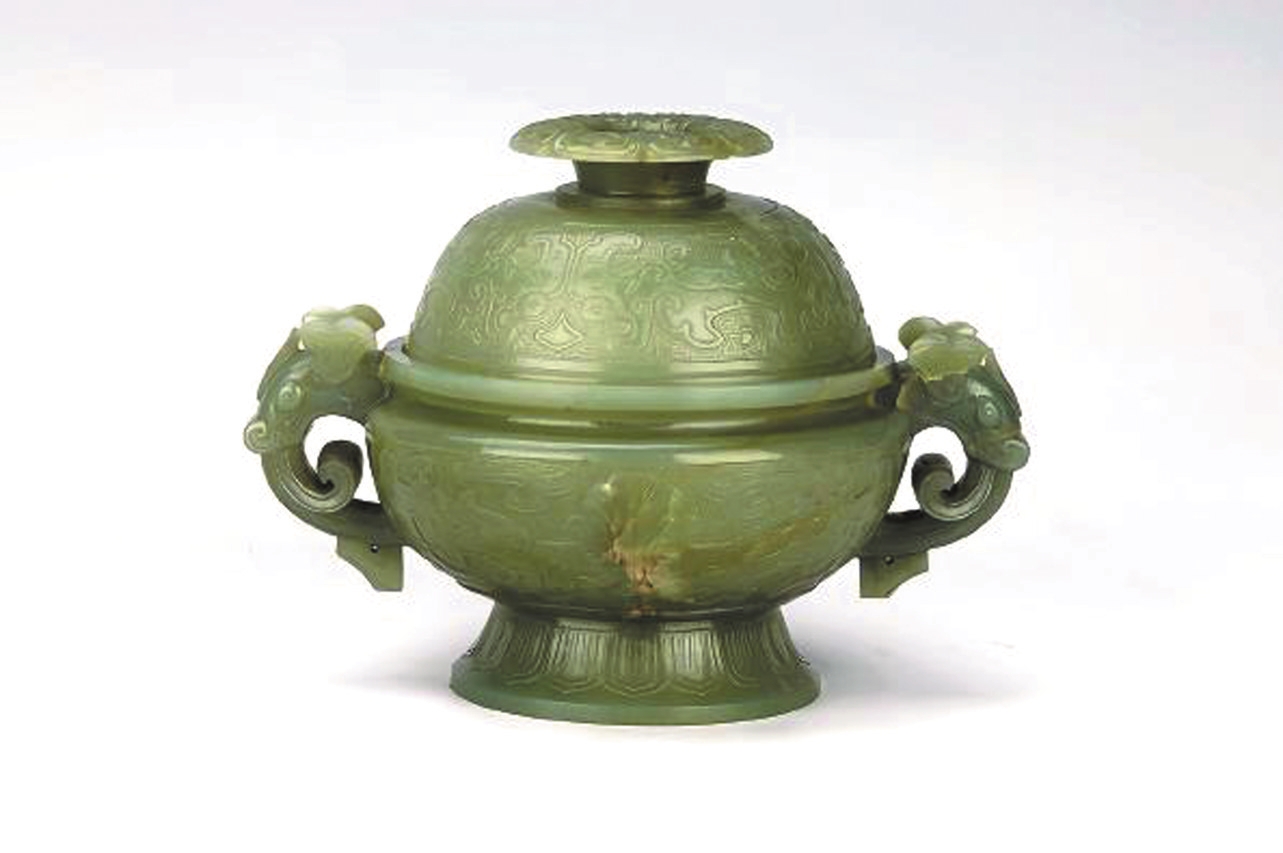 這件清代的獸面紋玉奩,高12.5厘米,口徑11.1厘米,底徑8.2厘米。青玉質(zhì)地,器物以整塊青玉為材料制作,圓形,由上下兩部分組成,高圈足。上面為奩蓋,下面為奩身。奩蓋看上去就像一只倒扣的大碗,釉面光潔,圓潤自然;蓋頂為空心,雕刻仰蓮瓣紋,蓋面雕刻獸面紋,紋飾細(xì)膩生動(dòng)。奩身與奩蓋相扣合,頸部兩側(cè)相對稱地各鏤雕獸首耳一只,分別與奩腹下相接。腹部滿浮雕獸面紋。圈足外一圈凸雕仰蓮紋,隨器形伸展,充滿動(dòng)感,讓人心生聯(lián)想:若是將之置于水中,一定頗有幾分清人汪懋麟筆下“玉奩亂潑脂水濃,春波半濺青裙?jié)瘛钡囊馊ぶ?。(李笙清?/p>