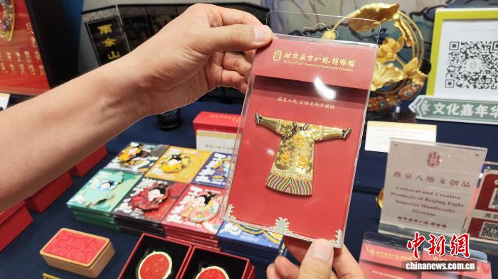 北京燕京八絕博物館依照館藏文物“京繡龍袍”設計的冰箱貼。(《中國新聞》報 任德輝 攝)