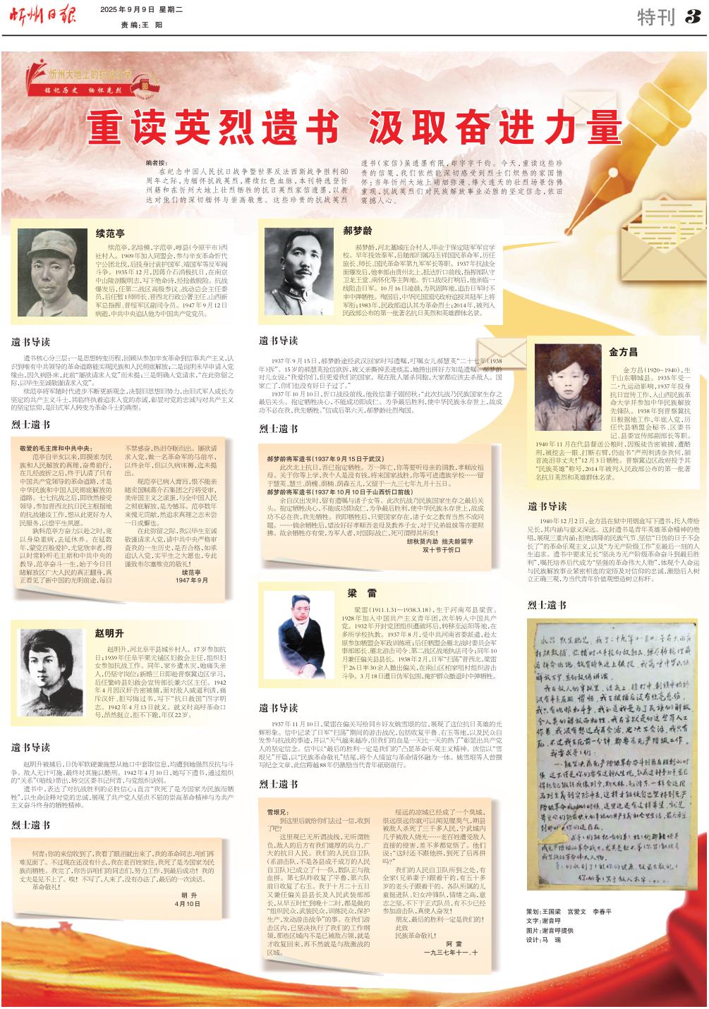 在紀念中國人民抗日戰(zhàn)爭暨世界反法西斯戰(zhàn)爭勝利80周年之際,為緬懷抗戰(zhàn)英烈,賡續(xù)紅色血脈,本刊特選登忻州籍和在忻州大地上壯烈犧牲的抗日英烈家信遺墨,以表達對他們的深切緬懷與崇高敬意。這些珍貴的抗戰(zhàn)英烈遺書(家信)雖遺墨有限,卻字字千鈞。今天,重讀這些珍貴的信箋,我們依然能深切感受到烈士們熾熱的家國情懷:當年忻州大地上硝煙彌漫、烽火連天的壯烈場景仿佛重現,抗戰(zhàn)英烈們對民族解放事業(yè)必勝的堅定信念,依舊震撼人心。