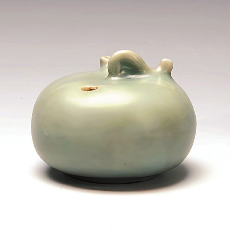 杭州博物館館藏的南宋龍泉窯粉青釉柿形瓷水注,宛如一枚剛摘下的青柿,小巧玲瓏,一掌可握。這件器物高4.6厘米,口徑6.2厘米,底徑3.8厘米,中空扁圓的鼓腹設計,盡顯靈動之態(tài)。頂部中心微凹,環(huán)繞的五片柿葉花紋若隱若現(xiàn),突破了傳統(tǒng)“一尖兩彎”的柿蒂紋范式,更添清新意趣。葉片間隙貼飾S形細泥條,構(gòu)成半圓形困藤鈕,精巧別致。肩部一側(cè)設出水短流,另一側(cè)留圓形注水孔,暗藏巧思:使用時先注滿水,移至硯臺旁以手指堵住注水孔,借負壓鎖住水流,再根據(jù)研墨需求緩緩移開手指控制出水量,實則是利用大氣壓強差調(diào)控水流的精妙設計,在方寸之間實現(xiàn)了功能與美感的完美融合。器物通體施粉青釉,釉面光潤細膩,足底處的火石紅痕跡,是歲月留下的鮮明印記。其精致的器型與瑩潤的釉色,盡顯文人雅士的清雅審美,既是南宋文房的精品之作,更見證了龍泉窯在青瓷史上的美學巔峰。