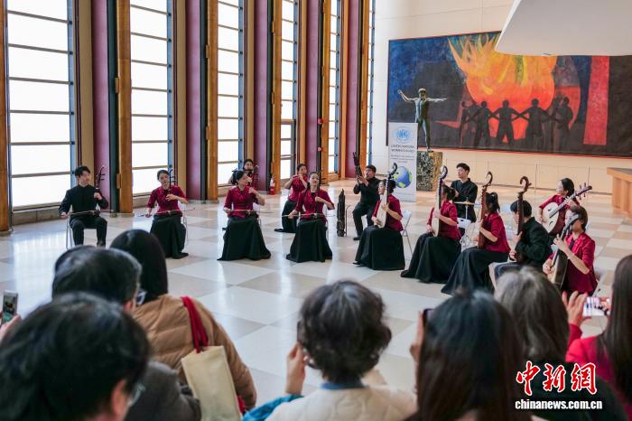 當(dāng)?shù)貢r間2月25日,來自中央音樂學(xué)院的民樂演奏家在紐約聯(lián)合國總部上演快閃音樂會。圖為音樂會現(xiàn)場。 中新社記者 王帆 攝