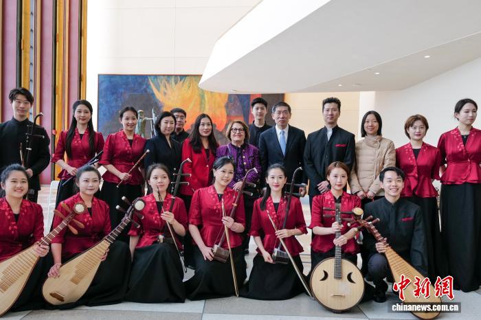 當(dāng)?shù)貢r間2月25日,來自中央音樂學(xué)院的民樂演奏家在紐約聯(lián)合國總部上演快閃音樂會。圖為聯(lián)合國副秘書長兼開發(fā)計劃署副署長徐浩良、聯(lián)合國婦女協(xié)會主席安妮特·海拉佩蒂安與演奏家及活動主辦方代表等合影。 中新社記者 王帆 攝