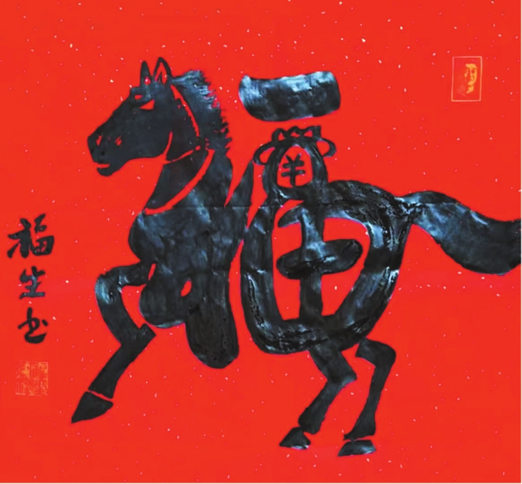 生肖文化,是中華民俗之根脈,王福生緊扣福字主題,應(yīng)時而作,應(yīng)物而書,將十二生肖意象與福字完美融合,創(chuàng)作出獨具氣象的“生肖?!毕盗?,合于《道德經(jīng)》“動善時”的智慧——順天時,合地利,應(yīng)人心,與時俱化。其馬年“馬上?!笨胺Q福字神品:以草書筆勢,將“福”與“馬”渾然合一,“礻”為駿馬昂首,鬃毛飛揚;“畐”為身軀矯健,奮蹄向前;“田”化為鞍飾,點睛傳神。整幅福作一氣呵成,筆走龍蛇,靈動奔放,卻又穩(wěn)而不飄,勁而不躁,正是老子“知其雄,守其雌”的筆墨體現(xiàn)。