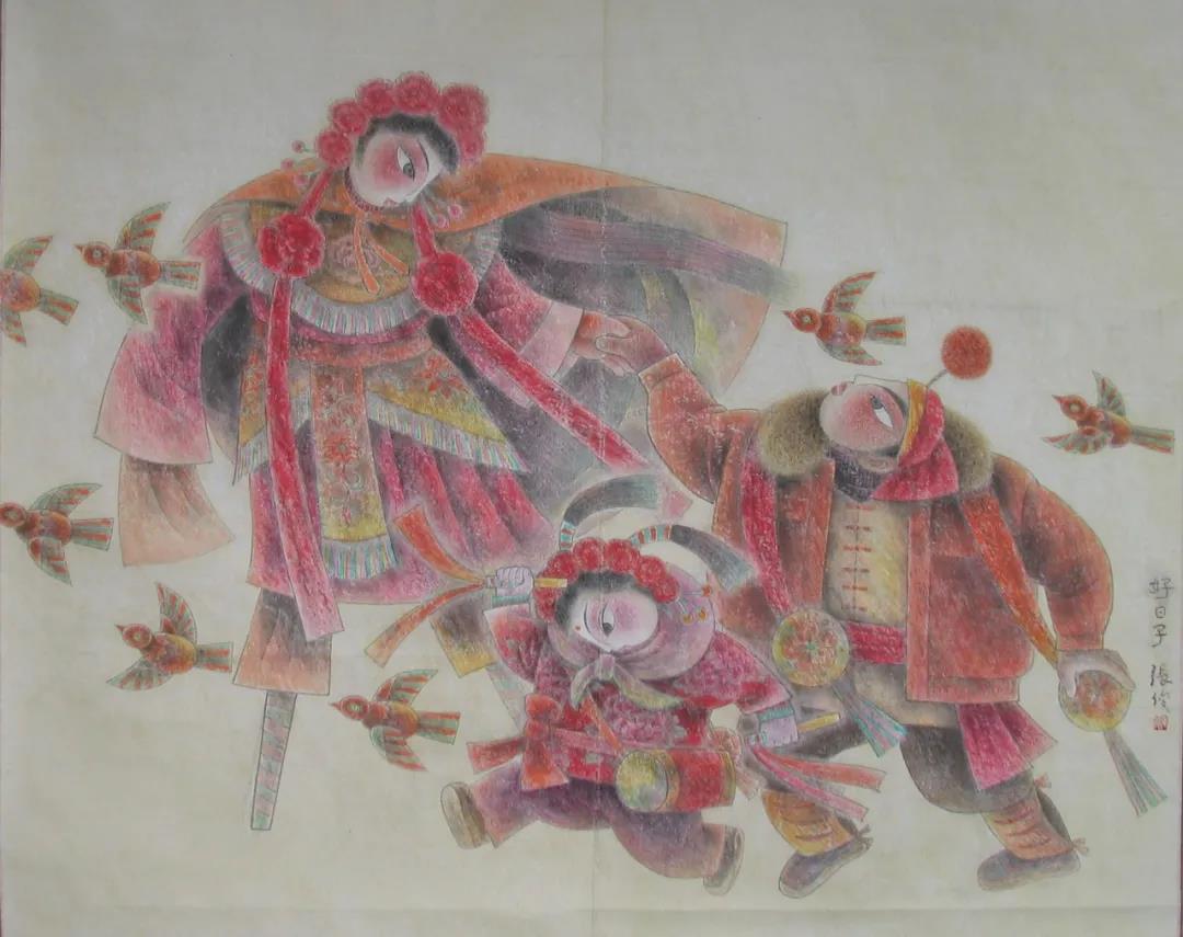 張俊這位畫家的畫就很有山西年畫的特點(diǎn),又吸收了山西民間藝術(shù)的東西,很有特色。這不光在其他省很少見,就是放到全國(guó)的展覽上也很少見。共性中的個(gè)性就是藝術(shù)。