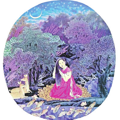 夏塘風(fēng)輕花落遲(中國(guó)畫)