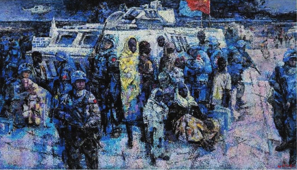 在續(xù)鶴賢眾多的作品中,從畫面表現(xiàn)效果方面,我是比較喜歡《和平使命——藍(lán)色交響曲》這幅作品的。無論畫面構(gòu)圖、色彩關(guān)系,還是人物造型以及表現(xiàn)技巧,都堪稱完美。畫面中無論人物形象、動(dòng)態(tài)、表情,還是人與自然背景,都處在一種和諧美好的關(guān)系中,從一個(gè)新的角度給予美好詮釋。這幅作品表現(xiàn)的是我們的維和部隊(duì)“子弟兵”以自己的生命守護(hù)著世界和平,講述著構(gòu)建人類命運(yùn)共同體的大國情懷。 (邢晨聲 文)