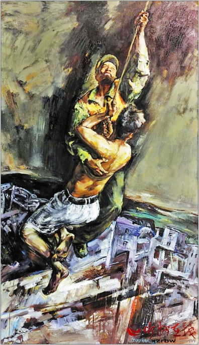 作品《空中救援》中,觀者首先感受到的就是難度。主題表現(xiàn)的事件難度和畫面表現(xiàn)處理的難度交織在一起,讓我們?cè)隗@險(xiǎn)、焦急的心理壓力下感受到生命的脆弱??罩芯仍闪松奈ㄒ煌ǖ?。救援同樣是險(xiǎn)象環(huán)生、驚心動(dòng)魄。從畫面處理技巧上是一種挑戰(zhàn),天空與地面的透視關(guān)系,動(dòng)感與靜態(tài)的對(duì)立統(tǒng)一,那種命懸一線的緊迫感對(duì)心理的沖擊力,通過大刀闊斧的刮刀、筆觸處理,和蒼涼緊迫的色調(diào)關(guān)系,準(zhǔn)確地展示了主題思想,大膽省略了一些不必要的細(xì)節(jié)描寫。用大筆觸、大色塊表現(xiàn)背景的壓抑和險(xiǎn)峻,救援主體成為沖破這一重壓的希望之色。沒有去刻意刻畫天與地的真實(shí)場景,簡潔概括但不呆板空洞,這種果斷的駕馭,是續(xù)鶴賢真實(shí)實(shí)力的體現(xiàn)。 邢晨聲 文