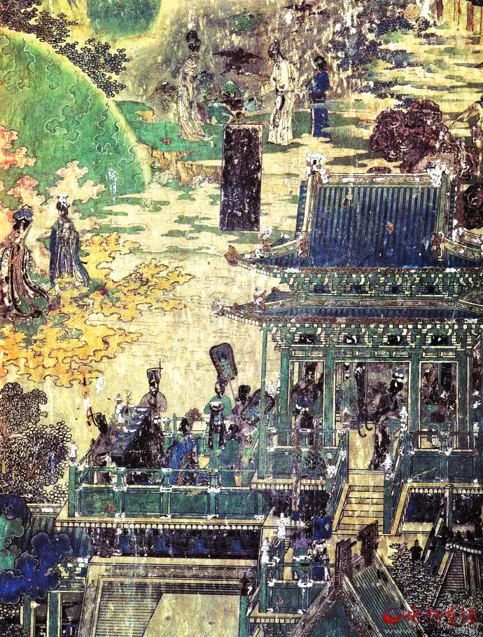 畫面中,有頭戴冠冕、身著長(zhǎng)袍的王子,焚香祈禱的王后;有嬉戲玩耍的兒童,酒樓市井里的說(shuō)唱賣藝者;還有撐傘的、捧鳥籠的凡夫俗子,儼然一幅幅生動(dòng)的古代宮廷生活圖、古代市井圖。豪華宮殿、樓閣、古塔、作坊、民居各類建筑應(yīng)有盡有,無(wú)不體現(xiàn)出畫師高超的技藝。