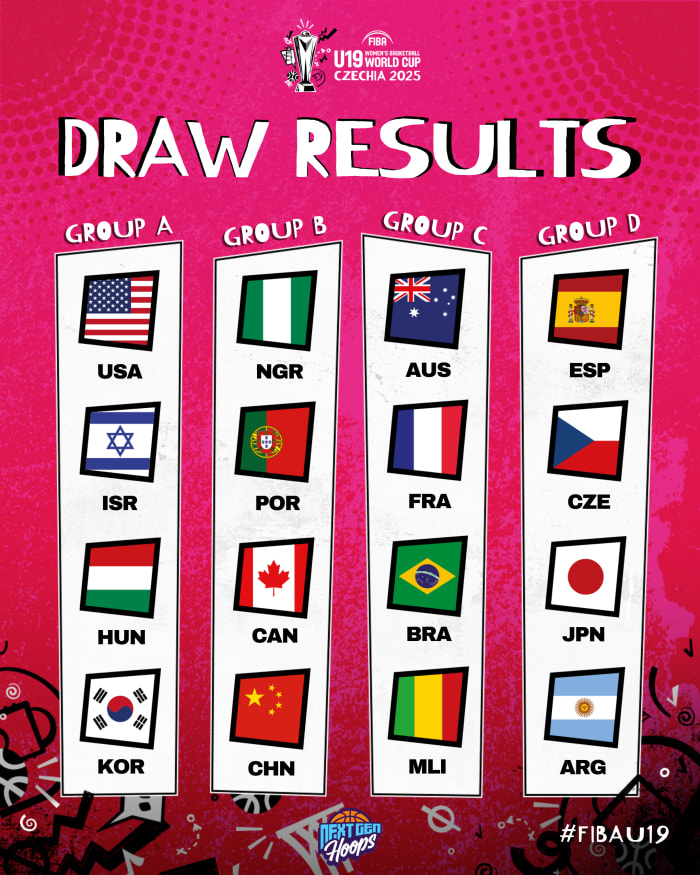 一共有16支來自世界各地的U19隊伍將參加7月12日至20日在捷克布爾諾舉行的U19女籃世界杯,這16支球隊被分為四個小組。A組包括美國隊、以色列隊、匈牙利隊和韓國隊,C組是澳大利亞隊、法國隊、巴西隊和馬里隊,D組是西班牙隊、捷克隊、日本隊和阿根廷隊。