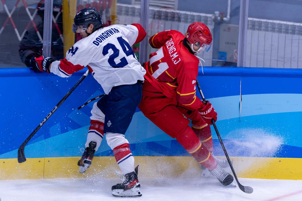 2月4日,中國隊(duì)球員鄭明舉(右)在比賽中拼搶。新華社記者 黃偉 攝