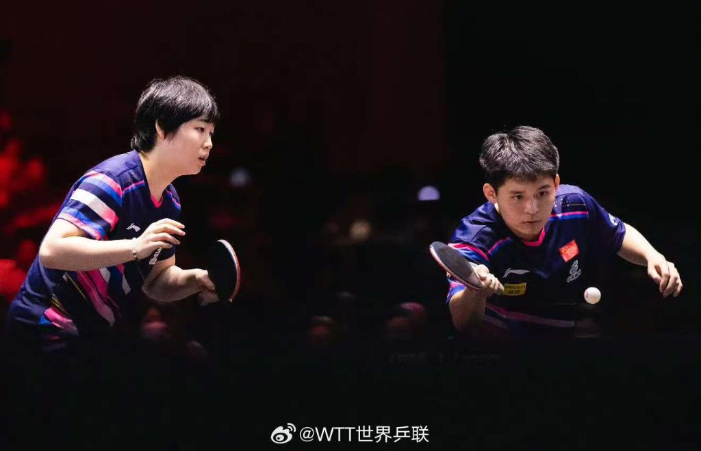 2月7日,林詩棟(右)/蒯曼在比賽中。圖片來自世界乒聯(lián)官方微博