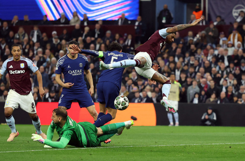 在維拉公園球場的雨戰(zhàn)中,首回合主場3:1勝出的巴黎圣日耳曼先聲奪人。第11分鐘,登貝萊左路突破后橫傳門前,維拉門將馬丁內斯撲球失誤,阿什拉夫抓住機會勁射破網(wǎng)?!按蟀屠琛痹诘?7分鐘打出高效反擊,登貝萊助攻左后衛(wèi)門德斯低射命中,將領先優(yōu)勢擴大為2:0。