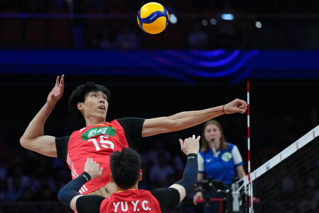 6月11日,中國(guó)隊(duì)球員彭世坤在比賽中扣球。新華社記者 李一博 攝