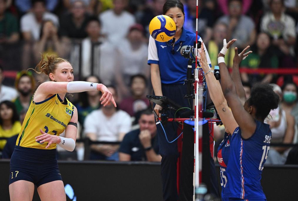 巴西隊(duì)在小組賽中曾以3:2險(xiǎn)勝法國隊(duì),這次她們以27:25、33:31和25:19勝出。前兩局的爭(zhēng)奪異常激烈,第二局更是一波三折。法國隊(duì)一度取得19:15的優(yōu)勢(shì),卻被巴西隊(duì)連得4分追成19平。此后,巴西隊(duì)以24:22率先拿到局點(diǎn),卻被法國隊(duì)連得3分以25:24反超。領(lǐng)先幾度易手、雙方又多次錯(cuò)過局點(diǎn)之后,比分來到31平。關(guān)鍵時(shí)刻,庫迪耶斯扣球成功,接下來加比在反擊中推攻得分,幫助巴西隊(duì)以33:31險(xiǎn)勝。