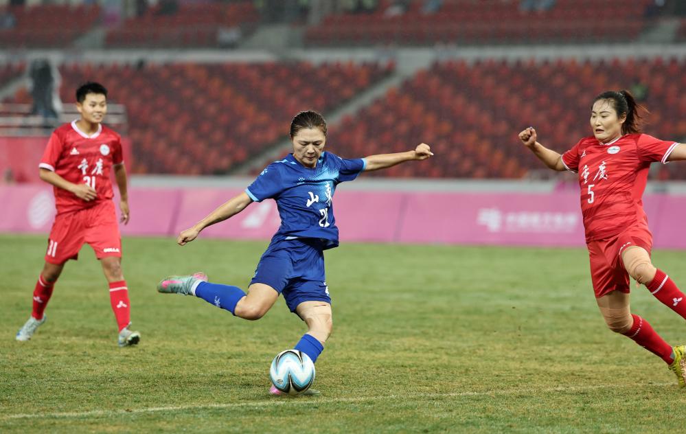 11月4日,山東隊(duì)球員孫方欣(中)在比賽中射門。新華社記者 王鵬 攝