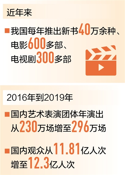 在作品質(zhì)量提升的同時,我國文化產(chǎn)品的供給能力也在持續(xù)增強(qiáng)。目前我國每年推出新書40萬余種、童書4萬多種、電影600多部、電視劇300多部、動漫400多部……眾多文化產(chǎn)品的生產(chǎn)規(guī)模位居世界前列。演出市場持續(xù)繁榮,2016年到2019年,國內(nèi)藝術(shù)表演團(tuán)體年演出場次從230萬場增長至296萬場,國內(nèi)觀眾從11.81億人次增加至12.3億人次,其中農(nóng)村觀眾超過7億人次。