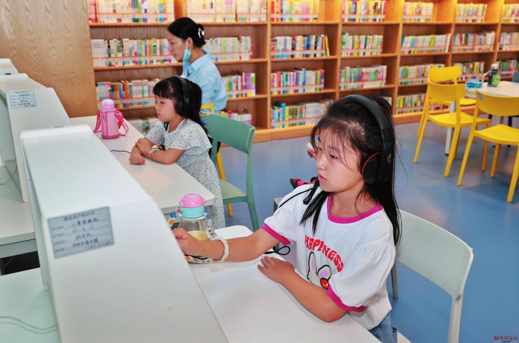 多彩暑期是孩子們博覽群書的最佳時(shí)期。7月28日,在市圖書館,小讀者們?cè)趦和喿x機(jī)上體驗(yàn)點(diǎn)觸、互動(dòng)學(xué)習(xí)的快樂。(記者張存良攝)