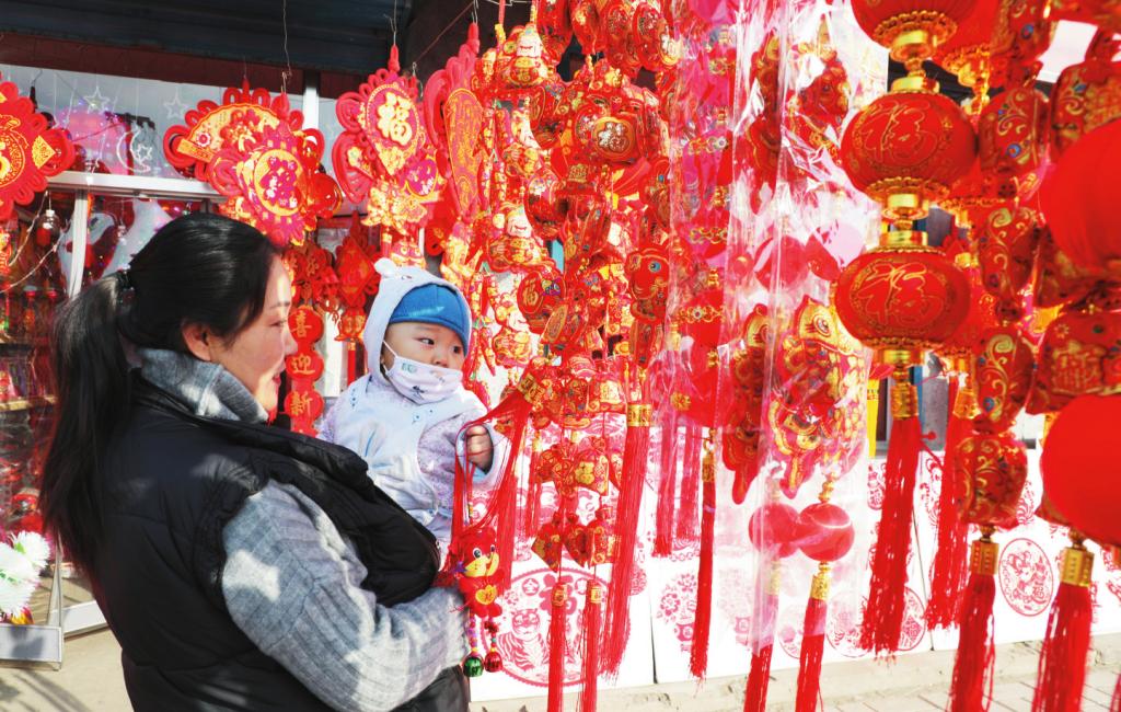 近日,在原平市小集鎮(zhèn)批發(fā)市場,人們紛紛選購大紅“?!弊?、紅燈籠、中國結、春聯(lián)、生肖虎元素的節(jié)日喜慶物品,紅紅火火迎接新春佳節(jié)。 (褚 震 攝)