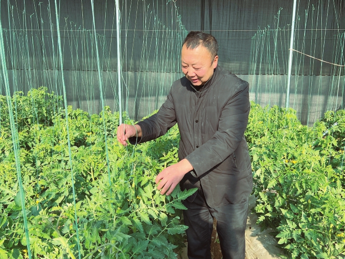 陽高縣迎春蔬菜種植專業(yè)合作社負責人王學斌在育苗示范基地查看小番茄苗長勢。 本報通訊員攝