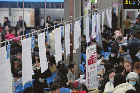2月5日,太原人才大市場內(nèi),求職者正在尋覓適合自己的工作崗位。當(dāng)日,春節(jié)后首場大型招聘會——應(yīng)往屆畢業(yè)生大型招聘會在此舉行,吸引了5000多人入場求職。