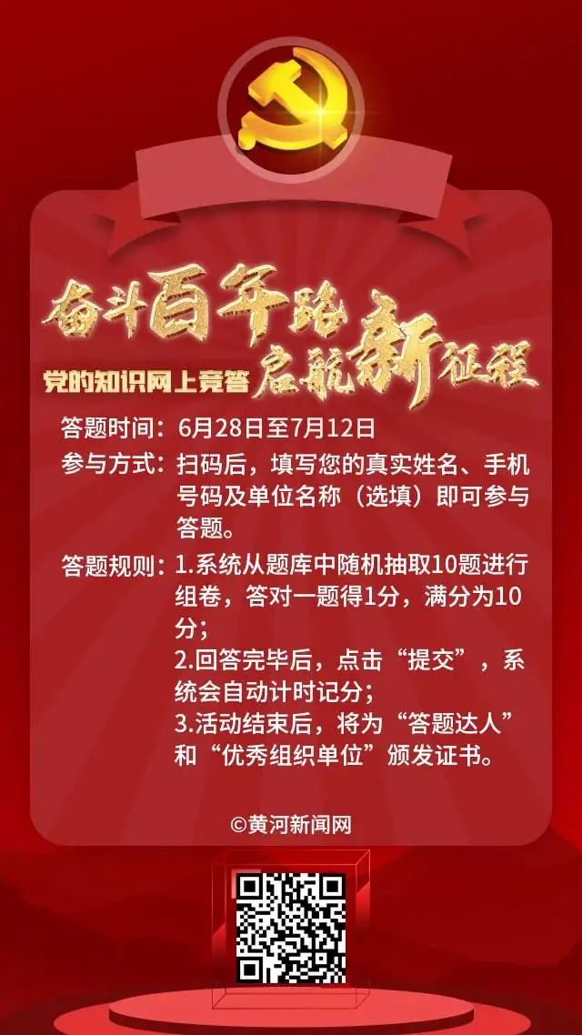 學(xué)習(xí)百年黨史,傳承紅色基因,汲取奮進(jìn)力量。為慶祝中國共產(chǎn)黨成立100周年,重溫黨的光輝歷程與偉大成就,扎實(shí)推動(dòng)黨史學(xué)習(xí)教育走深走實(shí),由山西省委網(wǎng)信辦指導(dǎo)、黃河新聞網(wǎng)承辦的【奮斗百年路 啟航新征程】黨的知識(shí)網(wǎng)上競(jìng)答正式上線,邀您參與!