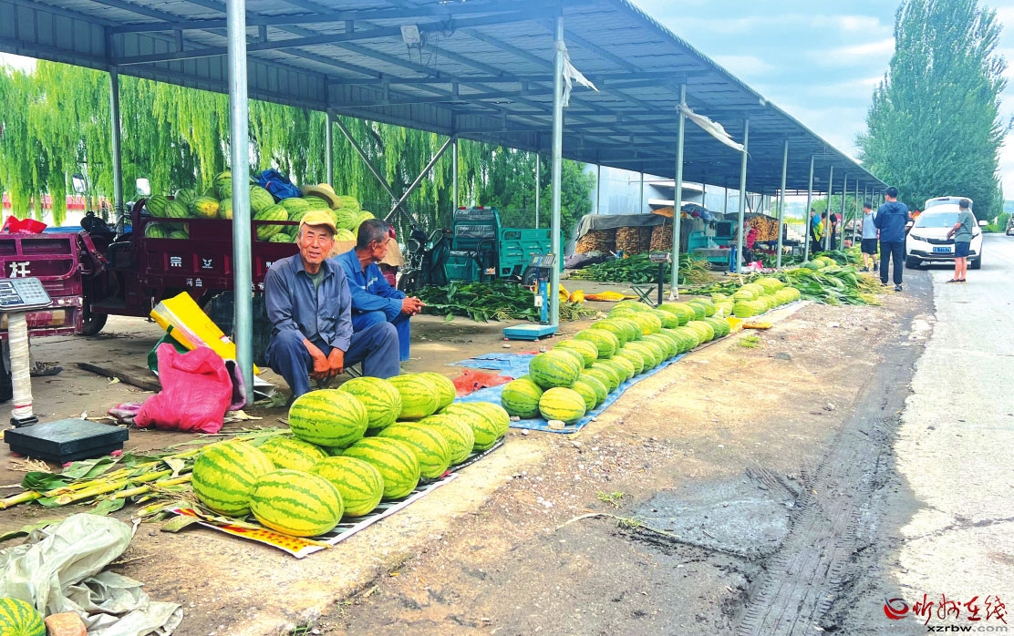市場有回響,品質(zhì)過硬銷路旺。在村里的瓜果交易市場,75歲的鄔培林?jǐn)偽磺埃慌排艂€(gè)頭飽滿的西瓜格外顯眼。有著多年種植經(jīng)驗(yàn)的他對(duì)市場行情了如指掌:“西瓜上市半個(gè)多月了,剛開始賣兩元一斤,現(xiàn)在是6角一斤,正在陸續(xù)降價(jià)?!彪m然價(jià)格隨上市時(shí)間有所回落,但西瓜品質(zhì)好不愁銷路。
