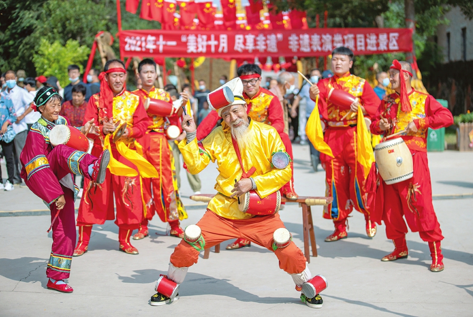 10月2日,民間藝人在鹽湖區(qū)東郭鎮(zhèn)嵐山根景區(qū)表演國家級非遺“萬榮花鼓”。國慶長假期間,運城市鹽湖區(qū)東郭鎮(zhèn)嵐山根景區(qū)在做好疫情防控的同時,推出“非遺進景區(qū)”、蒲劇展演等豐富多彩的民俗活動,吸引了眾多游客前來游玩。(閆鑫攝)