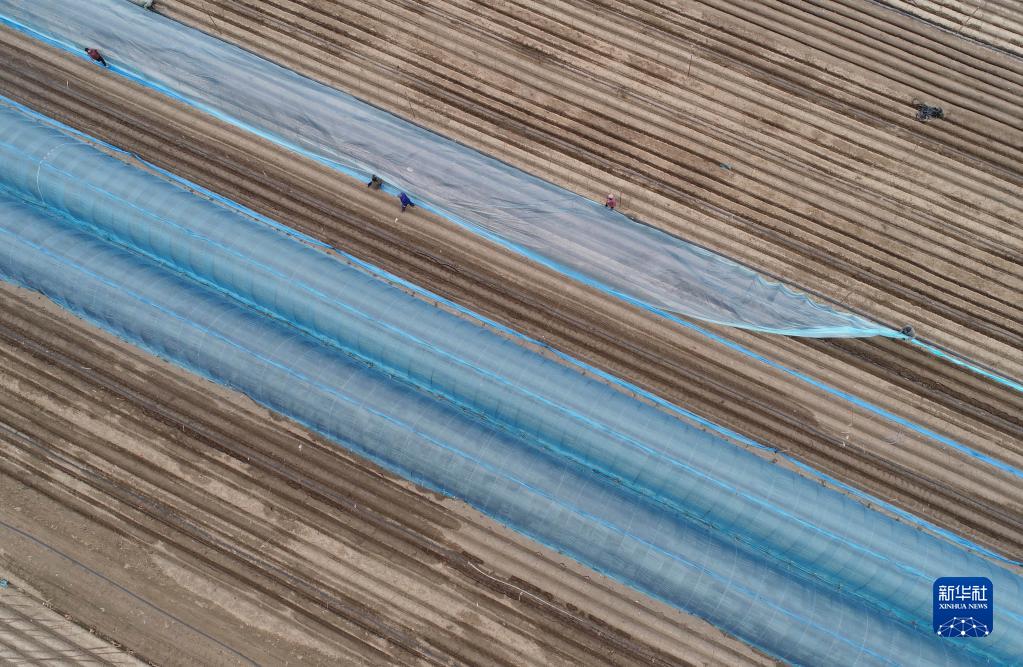 在河北省趙縣韓村鎮(zhèn),農民在搭建姜棚(3月30日攝,無人機照片)。(新華社記者 楊世堯 攝)