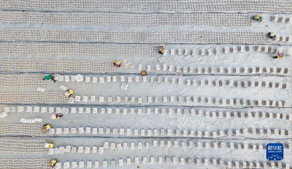 在貴州省銅仁市萬山區(qū)敖寨鄉(xiāng)中華山村食用菌種植基地,農民在田間擺放菌棒(4月4日攝,無人機照片)。(新華社發(fā) 彭俊 攝)