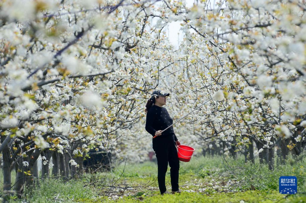 在河南省駐馬店市汝南縣宿鴨湖街道五里崗村,當地果農為梨樹人工授粉(4月1日攝)。(新華社發(fā) 孫凱 攝)