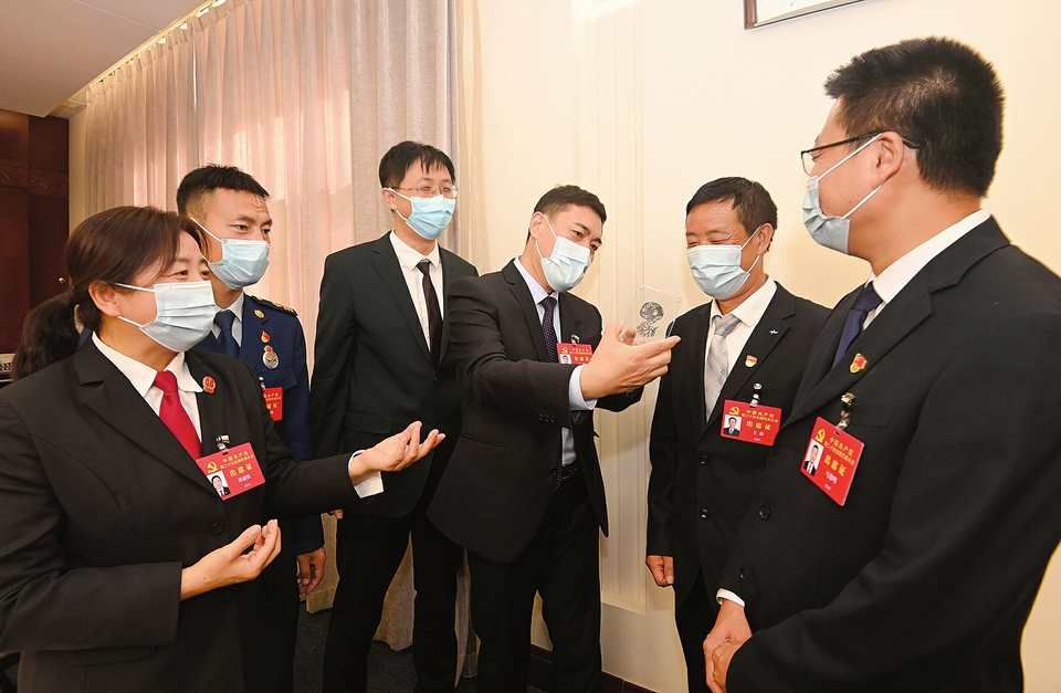 10月18日,出席黨的二十大的山西團(tuán)代表田亞欣、張高峰、張靖、牛國棟、王春、馬黎明(自左至右)在會(huì)議間隙圍繞創(chuàng)新是第一動(dòng)力話題展開討論。(記者李聯(lián)軍攝)