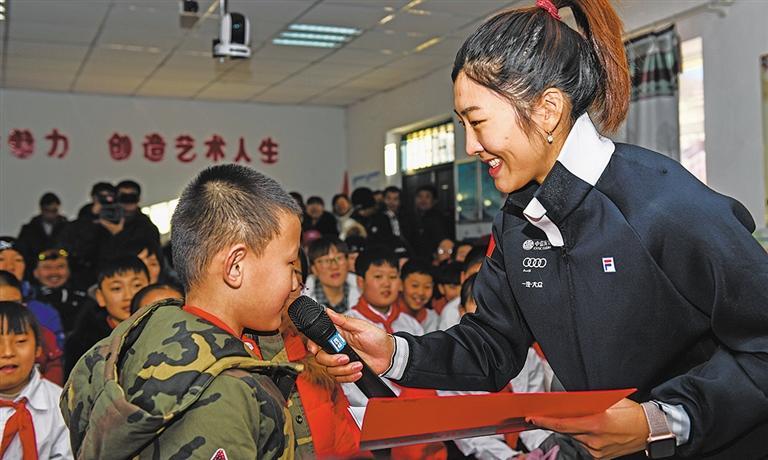 徐夢桃(右)在內(nèi)蒙古阿爾山市白狼鎮(zhèn)白狼小學(xué)為當?shù)匦W(xué)生普及滑雪知識(二〇一八年十二月攝)。新華社記者 劉 磊攝