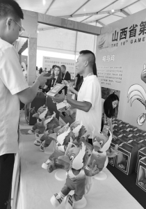 開幕式前,提前一兩個小時安檢入場的觀眾,遠遠就看到“翔翔”的召喚,紛紛在吉祥物專營區(qū)扎堆?!?8元一個,就剩30個了?!睂I區(qū)的售賣者告訴山西晚報記者,他們也沒想到這只褐馬雞如此受歡迎,很快就要被搶沒了。大同的趙女士搶到一個,她說朋友從外地剛回來不方便出門,讓她買一個留作紀念。