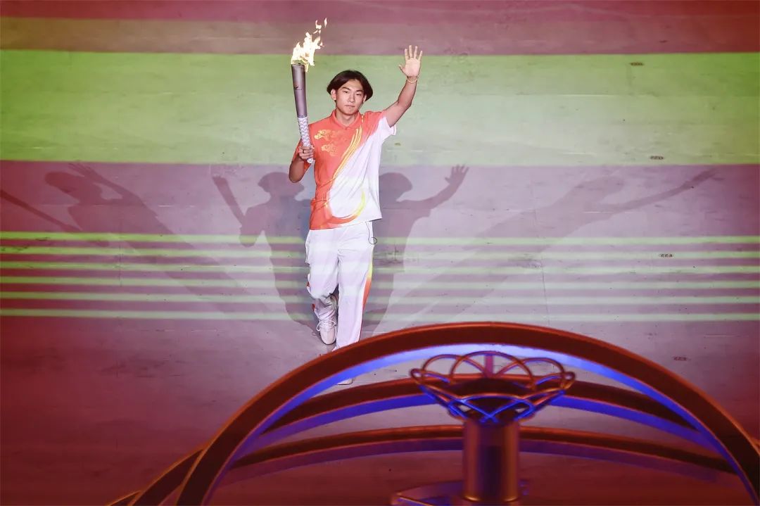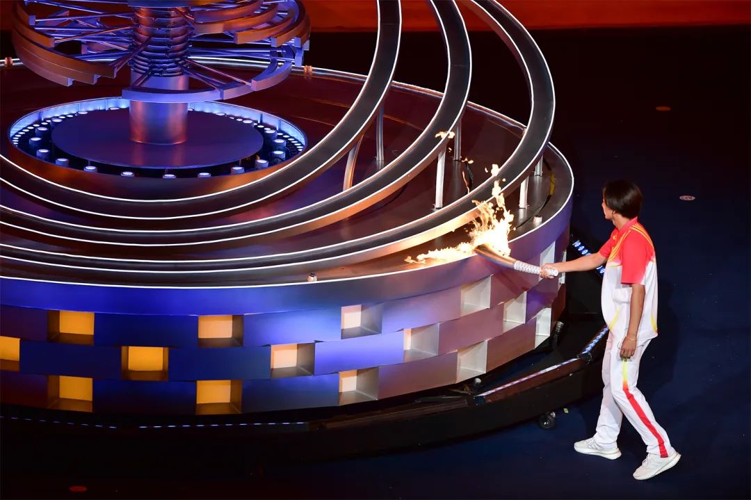 開幕式之夜,最為激動人心的就是點火時刻。在射擊世界冠軍張益梵、鄉(xiāng)村干部王春、環(huán)衛(wèi)工人孫秀蘭、大國工匠官生花、公交司機(jī)馮冰依次傳遞過后,火炬來到了最后一棒火炬手、北京冬奧會冠軍蘇翊鳴的手中。主火炬塔點火裝置以山西民俗“旺火”為設(shè)計依據(jù),采用清潔能源“微火”點燃的方式。蘇翊鳴手持火炬,在萬眾矚目之下,以“微火”點“旺火”,歷史、現(xiàn)在與未來,在這一刻融匯賡續(xù)。