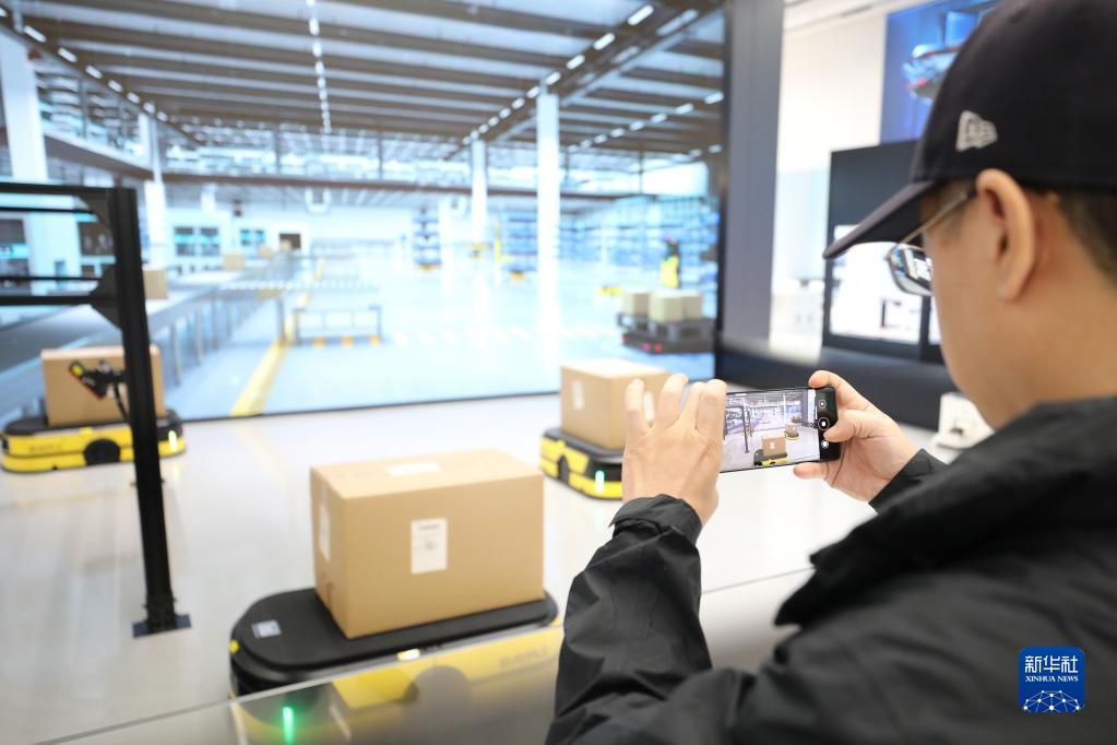 5月22日,參觀者在浙江大華技術(shù)股份有限公司的展廳內(nèi)拍攝一款智能運(yùn)輸車(chē)。新華社記者 杜瀟逸 攝