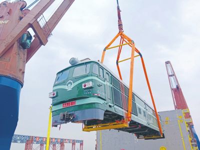 東風4B內燃機車體作為中國鐵路第二代電傳動內燃機車的代表車型,是中國鐵路史上產量最大、運用最廣泛、技術最成熟的內燃機車車型之一。因車體單件長達22米、重達87噸,且沒有固定吊點、重心難尋,致使其吊裝不同于以往發(fā)運貨類,吊裝過程極易出現(xiàn)傾斜等情況,吊裝難度系數極高,需兩臺船吊采用“兜吊”的軟吊方式進行作業(yè),這對作業(yè)司機的操作提出了極高的要求,必須做到“三個同步”:兩臺船吊起吊高度同步、起升速度同步、轉向頻率同步。