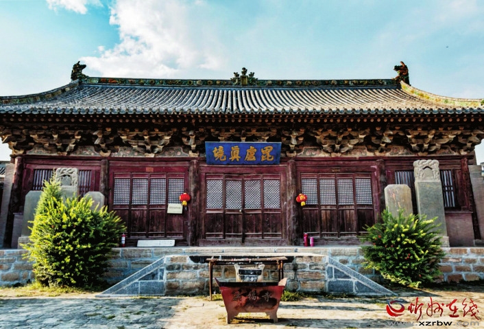 該寺建于高7米的土臺之上,四周筑高堡圍墻,“踞高而臨深”。寺內(nèi)現(xiàn)存建筑除大殿外,還有東配殿5間,西配房5間,庫房3間。正殿懸匾“毗廬真境”。面闊5間,七檁六椽,懸山頂花琉璃獸脊。斗拱六鋪?zhàn)鲉纬p下昂,補(bǔ)間斗拱斜拱一朵。