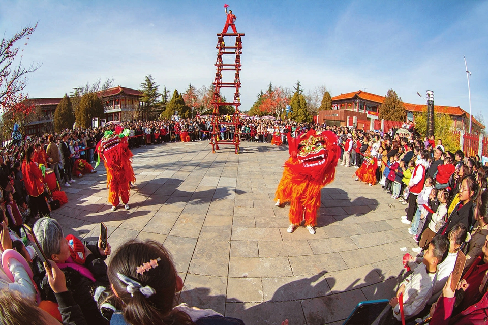 運城市鹽湖區(qū)舜帝陵景區(qū)內(nèi)舞獅隊正在進(jìn)行舞獅表演。姜樺攝