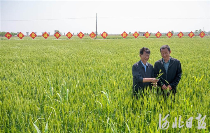 2023年5月,河北省滄州市黃驊市舊城鎮(zhèn)仙莊片區(qū)旱堿地麥田,后仙莊村村民楊東進(jìn)(右)和后仙莊村黨支部副書(shū)記劉玉鎖一起查看旱堿麥生長(zhǎng)狀況。 河北日?qǐng)?bào)記者 趙杰 攝