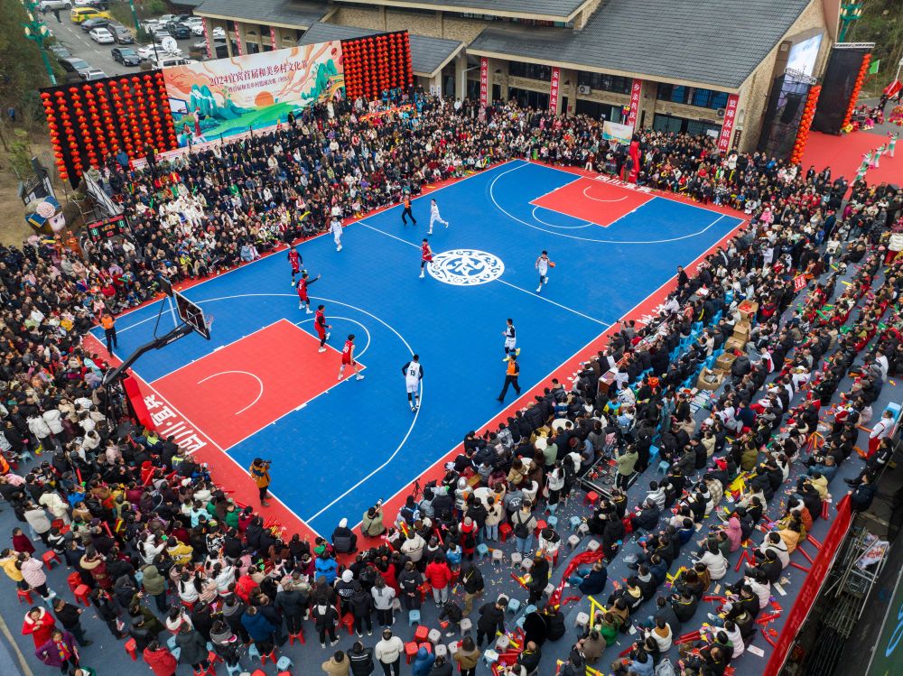 2024年1月29日,村民、游客在現(xiàn)場(chǎng)觀賽(無人機(jī)照片)。當(dāng)日,在四川省宜賓市珙縣巡場(chǎng)鎮(zhèn)三合村,2024宜賓首屆和美鄉(xiāng)村文化節(jié)暨首屆和美鄉(xiāng)村籃球決賽(村BA)舉行,同時(shí),現(xiàn)場(chǎng)還舉行了非遺年貨購物節(jié)、消費(fèi)券發(fā)放等活動(dòng),以賽事經(jīng)濟(jì)激發(fā)鄉(xiāng)村活力。新華社發(fā)(莊歌爾攝)