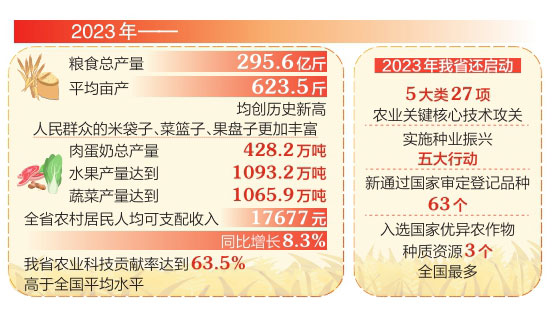 一分耕耘一分收獲。近年來(lái),我省糧食和重要農(nóng)產(chǎn)品生產(chǎn)穩(wěn)定、供給充足,農(nóng)業(yè)農(nóng)村現(xiàn)代化不斷邁出新步伐。2023年,糧食總產(chǎn)量295.6億斤,平均畝產(chǎn)623.5斤,均創(chuàng)歷史新高;人民群眾的米袋子、菜籃子、果盤子更加豐富,肉蛋奶總產(chǎn)量428.2萬(wàn)噸,水果、蔬菜產(chǎn)量分別達(dá)到1093.2萬(wàn)噸、1065.9萬(wàn)噸;全省農(nóng)村居民人均可支配收入17677元,同比增長(zhǎng)8.3%。這些成績(jī)的取得,得益于科技賦能助力。2023年我省農(nóng)業(yè)科技貢獻(xiàn)率達(dá)到63.5%,高于全國(guó)平均水平。