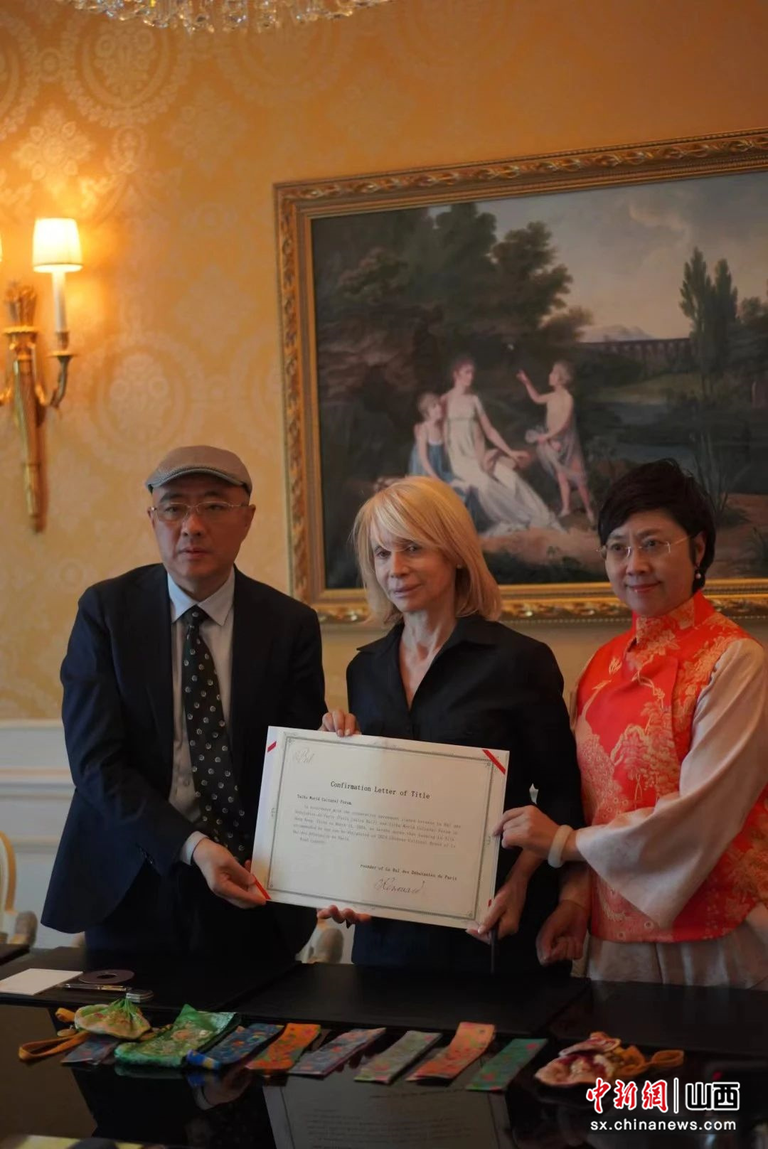 圖為:太湖世界文化論壇副主席兼秘書長鄭傳焮(左)、巴黎名媛舞會創(chuàng)始人奧菲莉·雷努阿(中)、中國國家級非物質(zhì)遺產(chǎn)保護織造技藝(潞綢)傳承人王淑琴在簽約儀式現(xiàn)場。