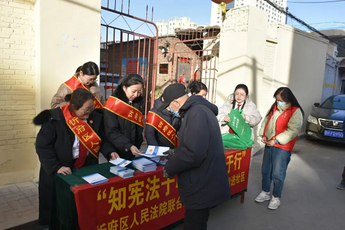 為進(jìn)一步弘揚(yáng)法治精神,發(fā)揮人民法院在基層社會治理中的積極作用,近日,忻府區(qū)法院與團(tuán)東社區(qū)聯(lián)合開展“知憲法于心,守法律于行”憲法宣傳活動。