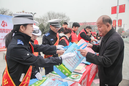 活動現(xiàn)場,交警支隊宣傳科、古城大隊七一崗的交警們身披綬帶,與各單位的志愿者們一起設(shè)立宣傳臺,擺放交通事故警示教育宣傳展板,為過往群眾提供交管業(yè)務(wù)咨詢、開展電動自行車上牌上戶、騎行電動車要佩戴安全頭盔、駕車拒絕酒駕等普法宣傳,通過發(fā)放交通安全宣傳資料,向群眾講解安全過馬路、遠(yuǎn)離貨車盲區(qū)、“一盔一帶”等交通安全常識,倡導(dǎo)群眾自覺抵制交通陋習(xí),讓“走文明路、行文明車、做文明人”成為自覺和安全出行的前提。