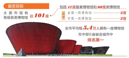 太原市充分發(fā)揮文物資源優(yōu)勢,將博物館作為文物保護利用改革的突破口,傾力建設凸顯地方文化特色的“博物館之城”。截至目前,太原市現(xiàn)有各級各類博物館達101座,包括41座備案博物館和60座類博物館,其中省屬一級博物館3座、市屬一級博物館2座。全市平均每5.4萬人擁有一座博物館,在中部6省省會城市中排名第一,遠超全國平均水平。