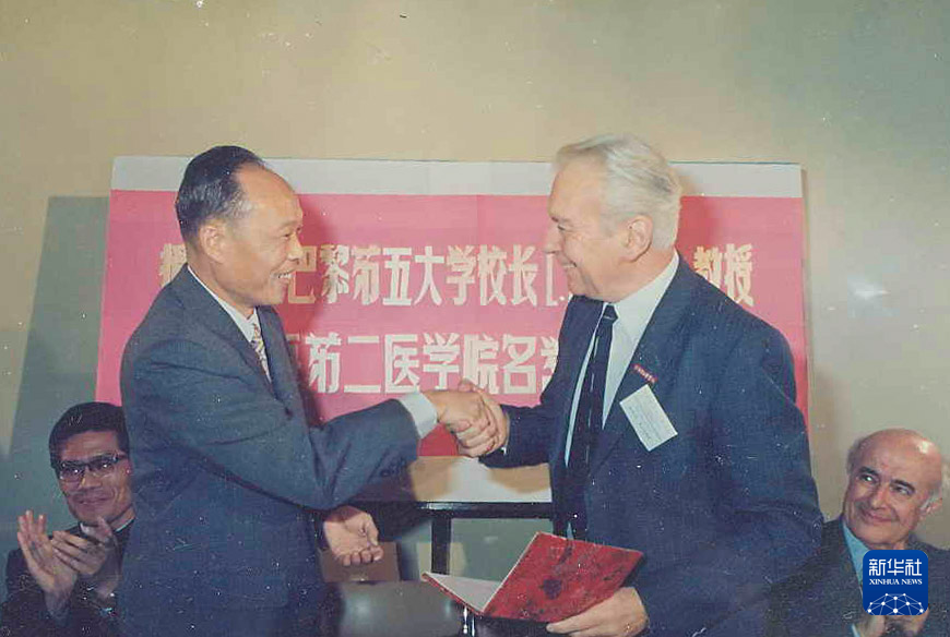 上海第二醫(yī)學(xué)院(現(xiàn)上海交通大學(xué)醫(yī)學(xué)院)校長(zhǎng)王振義(前左)授予法國巴黎第五大學(xué)校長(zhǎng)歐基埃名譽(yù)教授稱號(hào)(攝于1985年)。新華社發(fā)(上海交通大學(xué)醫(yī)學(xué)院供圖)