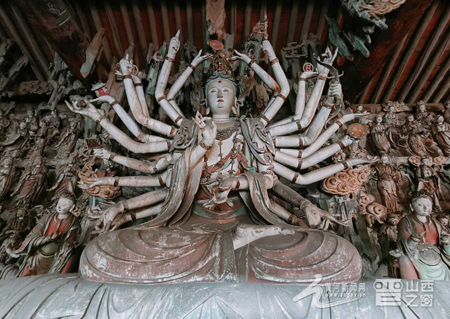 寺內擁有總計2000多尊彩塑,大者丈余、小者尺許,每一壁龕為一獨立神話或佛教故事,人物造型生動,神態(tài)逼真,尤其以“千手觀音像”與“韋馱像”最為經典。舞蹈《千手觀音》的靈感原型就是這尊千手觀音像。塑像高達數(shù)米,全身貼金,背后伸出上千只手臂,每只手掌上都有一只眼睛,錯落有致,整個造像氣勢恢宏,達到雕塑藝術中和諧、完美的境界。韋馱像巍然肅立,身披甲胄,神情凝重,整個身體呈現(xiàn)出一種微妙的動態(tài)平衡,是明代彩塑中少見的藝術杰作,被譽為“天下第一韋馱”“全國韋馱之冠”。景區(qū)講解員侯麗娟介紹:“這尊塑像的高明之處就在于匠師不落俗套,打破了一般程式的限制,賦予了韋馱一種時間的節(jié)奏性和動作的連續(xù)性,產生了雕塑作品的最高境界‘不動之動’?!?/p>
